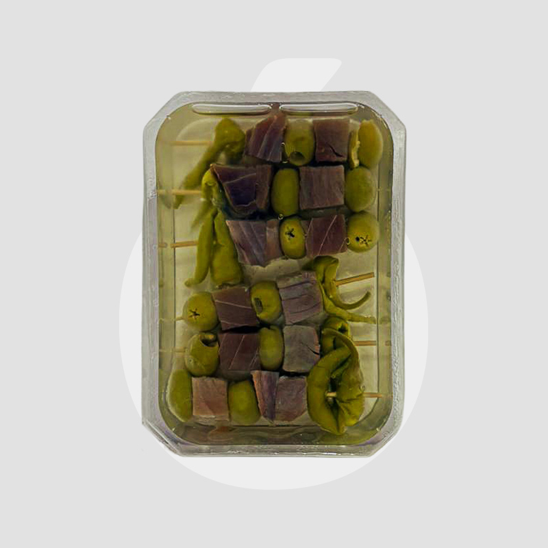 Gildas de Atún  y aceituna sevillana, Barbate una zona reconocida por su maestría en la elaboración de salazones y ahumados. Este origen garantiza que el atún sea de la más alta calidad, aportando un sabor inconfundible y una frescura excepcional al aperitivo.