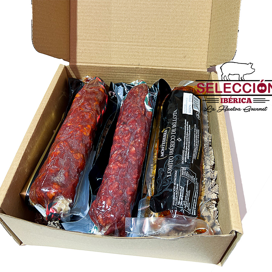Incluye salchichón de jamón al Pedro Ximénez, chorizo de lomo de bellota y media caña de lomo de bellota.